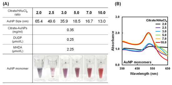 (A) Photographs and (B) UV–Vis spectra of AuNP monomers designed by attaching DUDP and MHDA to citrate–AuNPs with various citrate/HAuCl4 ratios. The concentration of the AuNP monomer in the aqueous dispersion was 0.95 mg/mL.