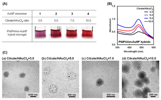 According to the method reported in our previous paper [55], AuNP monomers were prepared by attaching hydrophobic polymerizable acryloyl and hydrophilic carboxyl groups to the AuNP surface (Scheme S2). First, DUDP with two acryloyl groups was synthesized as a thiol to introduce polymerizable groups onto the surface of AuNPs (Scheme S3). 1H-NMR and FT-IR spectroscopy confirmed the successful synthesis of DUDP (Figures S3 and S4). As the introduction of hydrophobic acryloyl groups onto the AuNP surface reduced the stability of the AuNP monomers in water, hydrophilic carboxyl groups were simultaneously introduced by the reaction of MHDA, which contains carboxyl and thiol groups, with the AuNP surface. In a previous study, we found that the optimal molar ratio of DUDP and MHDA was 5 to 45 in preparing AuNP monomers stably dispersed in aqueous media. Therefore, AuNP monomers with various AuNP sizes were prepared with the optimal molar ratio of DUDP and MHDA. Figure 2 shows photographs and UV–Vis spectra of aqueous dispersions of AuNP monomers prepared from citrate–AuNPs of various sizes, which were tuned by the citrate/HAuCl4 ratios. The dispersions of AuNP monomers with a citrate/HAuCl4 ratio of 2.0 and 2.5 were purple, and their UV–Vis spectra showed a distinct shoulder peak at approximately 600 nm. This indicates that the AuNP monomers with a citrate/HAuCl4 ratio of 2.0 and 2.5 aggregated owing to their low stability in aqueous media. In general, AuNPs prepared by the Turkevich method are stably dispersed in aqueous media because of the repulsion of citrate groups on their surfaces. AuNP monomers were prepared through a ligand exchange of the citrate group with DUDP to introduce acryloyl groups to the citrate–AuNP surface. As an acryloyl group is hydrophobic and not charged, its introduction onto the AuNPs through the exchange of the charged citrate group with the hydrophobic acryloyl group lowers the stability of the AuNPs in aqueous media. On the other hand, dispersions of AuNP monomers with a citrate/HAuCl4 ratio of more than 2.5 still retained good dispersibility in aqueous media. As citrate–AuNPs with a citrate/HAuCl4 ratio of more than 2.5 are stabilized by hydrophilic citrate groups, the resulting AuNP monomers can maintain high stability in aqueous media. Therefore, in this study, AuNP monomers with a citrate/HAuCl4 ratio of more than 2.5 were used to prepare PNIPAAm–AuNP hybrids. In this paper, the AuNP monomers from citrate–AuNPs prepared with citrate/HAuCl4 ratios of 3.0, 5.0, 7.0, and 10.0, respectively (AuNP size: 35.9, 18.5, 16.7, and 13.0 nm), were named AuNP monomers 1, 2, 3, and 4, respectively. AuNP monomers 1, 2, 3, and 4 were copolymerized with NIPAAm to prepare hybrid microgels with various AuNP sizes.