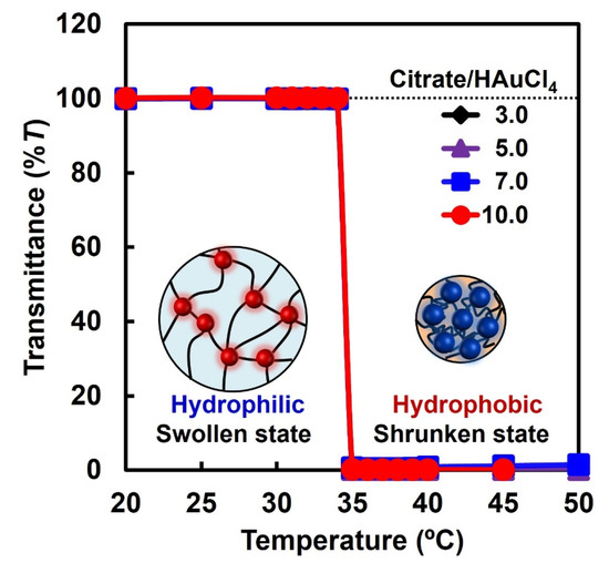 Responsive polymers have attractive functions, such as natural feedback systems, capable of drastic changes in their structures and properties, such as conformation and hydrophilicity, in response to stimuli. Various responsive polymers, gels, and particles have been strategically designed owing to their versatile applications and unique abilities to respond to various external stimuli [34,35], such as temperature [26,30,36,37], biomolecules [38,39,40], and multiple stimuli such as ions, pH, light, and temperature [41,42,43,44]. Combining AuNPs with stimuli-responsive polymers allows us to control their properties, stability in aqueous media, and recovery using stimuli, such as temperature and light. For example, AuNPs were immobilized within stimuli-responsive hydrogels for the development of sensors and catalysis, which can regulate their properties in response to external stimuli [7,31,45,46,47,48,49]. Such stimuli-responsive hybrids, composed of stimuli-responsive polymers and AuNPs, have attracted significant attention owing to their unique properties and many potential applications. In the preparation of stimuli-responsive polymer–AuNP hybrids, PNIPAAm has emerged as a prominent temperature-responsive polymer as it has a lower critical solution temperature (LCST) of 34 °C. In general, PNIPAAm–AuNP hybrids were prepared using the following three methods: First, the “grafting-to” method involves the introduction of thiol-terminated PNIPAAm onto the surface of AuNPs. Second, the “grafting-from” method involves the polymerization of NIPAAm monomers from the initiator-introduced surfaces of AuNPs. Both methods enable the production of temperature-responsive core-shell nanoparticles with an AuNP core and PNIPAAm chain shell [45,50,51]. Third, PNIPAAm–AuNP hybrids can be prepared by the reduction in Au ions within PNIPAAm microgels and hydrogels [25,26,52,53,54]. In general, while PNIPAAm covalently binds to the AuNP surfaces in the PNIPAAm–AuNP hybrids prepared using the first and second methods, AuNPs are physically entrapped within the PNIPAAm networks in the hybrids prepared using the third method. Unlike their standard method, our previous study proposed a simple method to prepare PNIPAAm–AuNP hybrids in which AuNPs are covalently linked with microsized PNIPAAm networks [55]. This method uses an AuNP monomer with polymerizable groups. We prepared AuNP monomers by attaching hydrophobic polymerizable groups and hydrophilic carboxyl groups onto the AuNP surface. The PNIPAAm–AuNP hybrid microgels were prepared by the copolymerization of the AuNP monomer with NIPAAm. The reduction of 4-nitrophenol (4-NP) to 4-aminophenol (4-AP) was catalyzed by the hybrid microgels at 25 °C but not at 40 °C.
