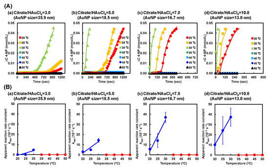 (A) Changes in 4-NP concentration during the reduction reaction of 4-NP to 4-AP using the PNIPAAm–AuNP hybrid microgel with various AuNP sizes at various temperatures. (B) Effect of temperature on the apparent reaction rate constant (kapp) of reduction using the hybrid microgel with various AuNP sizes. AuNP monomers prepared with various citrate/HAuCl4 ratios (a–d) and AuNP sizes were used to prepare the hybrid microgels.