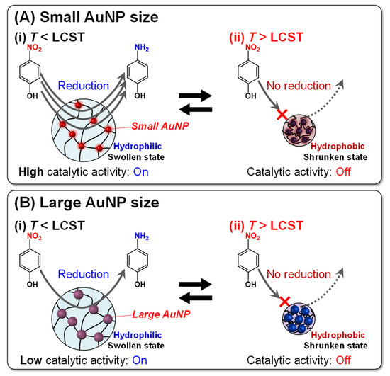Various factors such as size, shape, composition, the coordination number, and the surface chemistry of AuNPs play a crucial role in determining their catalytic activity [26,56,57,58,59,60,61,62,63,64]. As the size of AuNPs is the most important factor influencing their catalytic performance among these factors, significant efforts have been made to optimize the size and enhance the catalytic activity. Numerous studies have emphasized the importance of controlling the size of AuNPs by adjusting the stabilizer concentration [59,63,65,66]. The size tunability of AuNPs is important because it directly affects their catalytic activity. In general, AuNPs with a smaller size exhibit high catalytic activity owing to their larger specific surface area than those with a larger size. This is attributed to the fact that the increased surface area allows for a more efficient adsorption of reactant molecules onto the AuNP surface. In addition, AuNPs with a smaller size have more active sites because their reduced dimensions correspond to lower coordination numbers. Furthermore, researchers have recognized the critical role of the optimized size of AuNPs, particularly when they are loaded onto supporting materials. Such integration aims to enhance catalytic activity and selectivity through charge transfer between the AuNPs and the support. As highlighted by Cao et al., the size and shape of AuNPs depend on their catalytic performance in oxidation and reduction reactions [67]. Lin et al. reported the highest performance of Au/Al2O3 with a diameter of 3.4 nm among those of various sizes in the reduction reaction of 4-NP [60]. Similarly, Valden et al. and Laoufi et al. observed enhanced catalytic activity in CO oxidation with 2–3 nm AuNPs on TiO2 [68,69]. Bokhimi et al. also reported that the activity of AuNPs on rutile increased with decreasing the size from 6 to 3 nm [70]. In addition, Liang et al. highlighted the nuanced relationship between AuNP size, crystallinity, and defect concentration [62]. In contrast, Fenger et al. reported a unique relationship between AuNP size and catalytic activity for the reduction in 4-NP, in which the catalytic activity of cetyltrimethylammonium bromide-stabilized AuNPs increased with an increase in size from 3 to 13 nm, but decreased with an increase in size from 13 to 56 nm [59]. This might indicate that AuNPs with extremely small sizes are unsuitable catalysts for certain reactions. This is supported by the results reported by Donoeva et al. [58], in which triphenylphosphine-stabilized AuNPs with a size of only >2 nm on SiO2 exhibited catalytic activity in the oxidation of cyclohexene. Thus, many previous studies have indicated that the optimization of AuNP size is important for preparing stimuli-responsive polymer–AuNP hybrids with high catalytic activity.