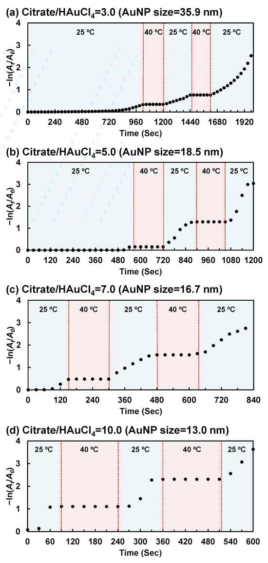 In a previous paper, we proposed a new method to prepare temperature-responsive polymer–AuNP hybrids using an AuNP monomer with polymerizable groups [55]. The resulting PNIPAAm–AuNP hybrid microgels switched their catalytic activity upon changing their temperature. In this study, we designed various AuNP monomers with different AuNP sizes, which is an important factor governing the catalytic activity of AuNPs, and prepared PNIPAAm–AuNP hybrid microgels using their AuNP monomers. This paper focuses on the effect of AuNP size on the temperature-responsive catalytic activity of the hybrid microgels. In general, the reduction of 4-NP to 4-AP is monitored to evaluate the catalytic activity of metal nanoparticles [17,36,42,75]. The reduction reaction of 4-NP can be easily monitored by measuring the absorbance of the sample solution at 400 nm, spectroscopically assigned to 4-NP [17,76]. When the reduction of 4-NP to 4-AP progresses, the absorbance of a sample solution at 400 nm decreases, and that at 300 nm increases simultaneously, corresponding to a color change of the solution from pale yellow to colorless. In this study, we investigated the catalytic activity of the hybrid microgels with different AuNP sizes in the reduction in 4-NP with excess NaBH4 by monitoring the absorbance of an aqueous 4-NP solution at 400 nm. Although the aqueous 4-NP solution changed from pale yellow to colorless after the addition of the hybrid microgel at 25 °C, it remained pale yellow at 40 °C (Figure S8). This indicates that the catalytic activity of the hybrid microgels was strongly influenced by temperature. To monitor the reduction of 4-NP to 4-AP using the hybrid microgels, we investigated the absorbance changes in an aqueous 4-NP solution as a function of time. The absorbance of the solution at 400 nm in the presence of the PNIPAAm–AuNP hybrid microgel at 25 °C decreased, whereas that at 300 nm increased, as shown in Figure S9A. Importantly, the absorbance at 400 nm in the presence of the hybrid microgel with a small AuNP size (13.0 nm) decreased more rapidly than that with a large AuNP size (35.9 nm). This implies that the catalytic activity of the hybrid microgel with a small AuNP size is higher than that with a larger AuNP size. This is attributed to the fact that the increased surface area allows for a more efficient adsorption of 4-NP onto the AuNP surface, and that AuNPs with a smaller size have more active sites because their reduced dimensions correspond to lower coordination numbers. In contrast, the UV–Vis spectra of the aqueous 4-NP solution with the hybrid microgels at 40 °C did not change (Figure S9B), indicating that no reduction reaction occurred at 40 °C.
