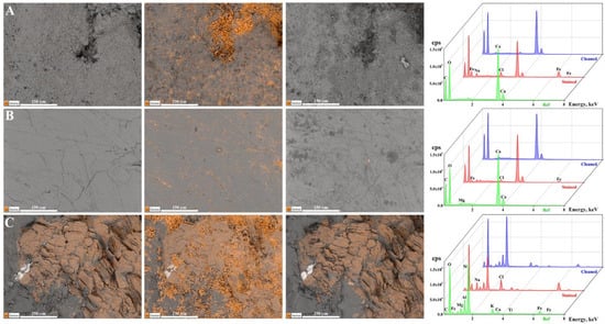All the lithotypes were observed through an electronic microscope to identify four areas of 1 mm2 on the stone samples. EDS microanalyses were performed on each of them before the deposition of rust suspension (reference), after the staining, and after the treatment with CS-Ox. For each lithotype, Figure 3 shows the SEM images, with iron highlighted in orange, of the reference, stained, and treated areas and the 3D comparison between the corresponding EDS spectra.