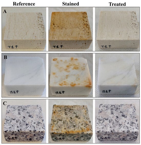 Photographs of the reference, stained with rusty iron grid and treated specimens subjected to the treatment with CS-Ox; (A) travertine, (B) marble, and (C) granite.