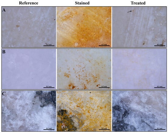 Stereomicroscope images at 56× of magnification of travertine (A), marble (B), and granite (C), reference, stained and treated with CS-Ox surfaces. In panel A (right), an evident spot of rust on the travertine-treated surface is indicated by a black arrow. Bar = 0.5 mm.