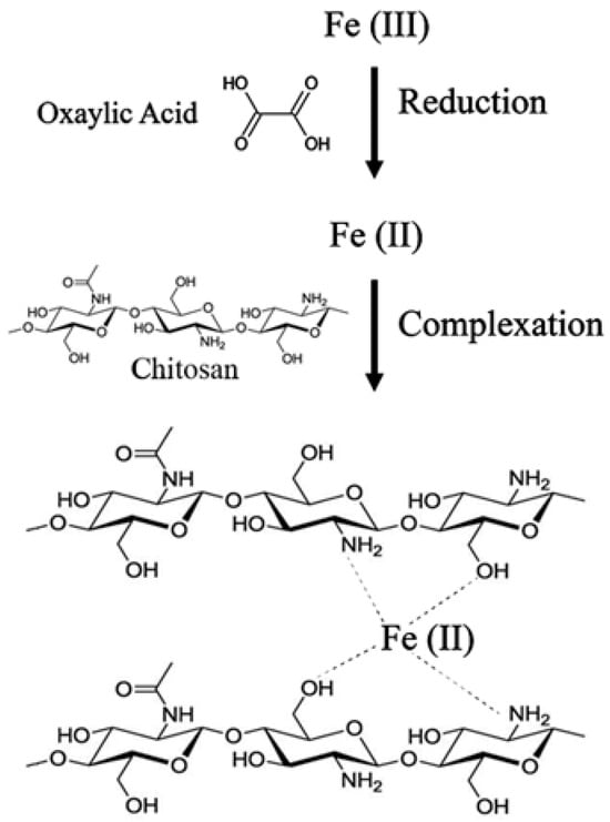Proposed mechanism of action of the chitosan-oxalic acid hydrogel in reducing Fe(III) and subsequent chelation of Fe(II) by chitosan.