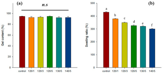 Gel content (a) and swelling ratio (b) of PVA/PLA hydrogels for different heat-treated temperatures and number of PLA mesh layers. Different letters denote statistically significant differences (p < 0.05) as determined by one-way ANOVA followed by Duncan’s multiple-range test.(n.s = No Significance).