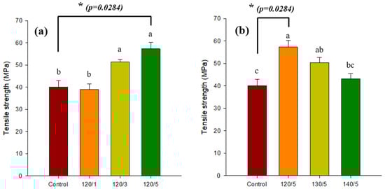Tensile strength of PVA/PLA hydrogels: (a) for different numbers of PLA mesh layers at 120 °C; (b) for different heat-treated temperatures of 5 layers of PLA mesh. The data are presented as mean ± standard deviation. Significant differences between treatments were identified using a two-sample t-test (* p < 0.05) and are denoted by asterisks. Post hoc analysis using one-way ANOVA and Duncan’s multiple-range test revealed significant differences (p < 0.05) between groups, which are indicated by different letters.