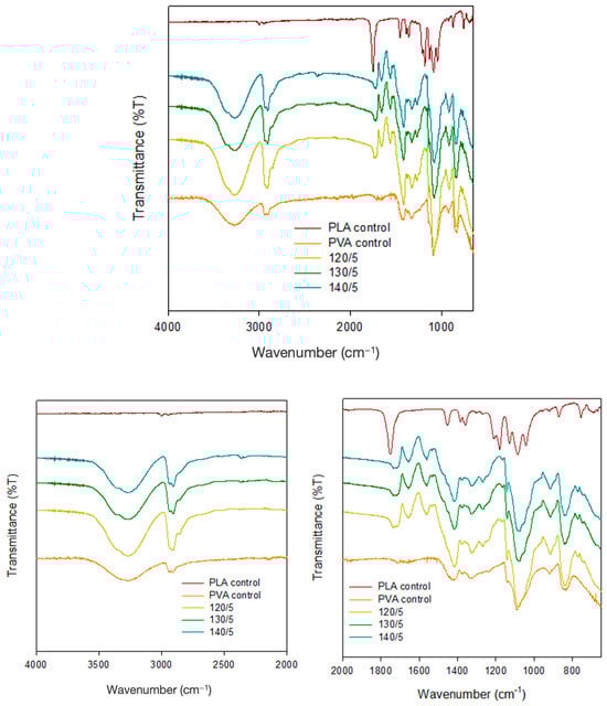FT-IR spectra of PVA/PLA (5 layers) scaffold for different heat-treated temperatures.