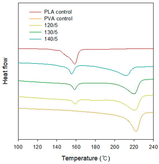 DSC curves of PVA/PLA (5 layers) hydrogels for different heat-treated temperatures.