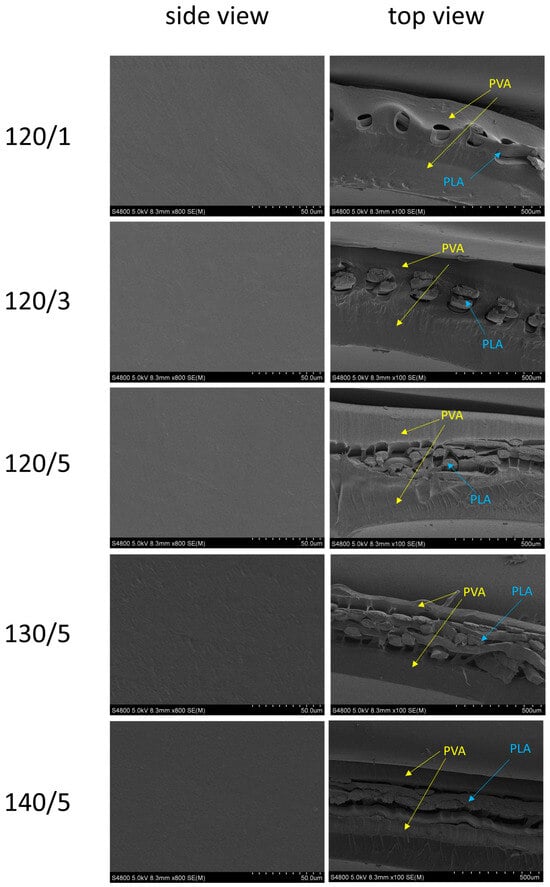 Figure 5 shows the SEM measurement results of the PVA/PLA hydrogel scaffolds as a function of the heat treatment temperature of PLA and the number of layers. The results are clear: The PLA mesh fabric was properly positioned inside the hydrogel. Cross-sectional measurements did not show any changes in appearance between samples. However, the thickness of the PLA mesh fabric tended to decrease with an increase in heat treatment temperature, especially for the sample with five layers. This led us to conclude that the PLA mesh fabric was thermally fused as the heat treatment temperature increased, leading to a decrease in strength.