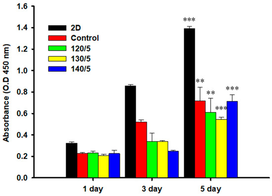 Figure 6 shows the results of the biocompatibility and cell adhesion characterization of the PVA/PLA hydrogel. Comparative studies were conducted among two-dimensional control (2D), an unreinforced PVA hydrogel (control), and PVA/PLA hydrogels with embedded PLA mesh fabrics subjected to varying heat treatments of 120, 130, and 140 °C. The scaffolds displayed uniform initial cell adhesion, with no notable difference in proliferation rates between the PVA/PLA scaffolds and the control over the initial culture period. The marked proliferation increase on the fifth day versus the first day clearly demonstrates the nontoxic nature and compatibility of the hydrogels for cellular growth. It is clear that the optimal reinforcement effect was achieved at 120 °C, which also coincided with the highest recorded cell proliferation. This suggests a positive correlation between the thermal conditioning at this temperature and the scaffold’s performance. From the tensile strength and MTT assay results, we confirmed the improvement of tensile strength while maintaining cell viability at the heat treatment temperature of 120 °C. However, a comparison to the two-dimensional control revealed subdued growth, potentially ascribable to the limited duration of the study.