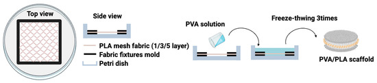 The PLA mesh fabric for tea bags was cut into 10 cm × 10 cm pieces and then laminated with 1, 3, and 5 sheets at 120 °C (120/1, 120/3, 120/5) using a hot press to bond the fabric layer by layer to produce comparative samples based on the number of layers. Also, to produce comparative samples based on temperature, 5 sheets of fabric were laminated and hot-pressed at 120, 130, and 140 °C (120/5, 130/5, 140/5) to prepare samples. The fabrics were placed between two square silicone molds (4.5 cm × 4.5 cm) and fixed in the center of Petri dishes (90 cm × 15 mm). Next, to prepare the PVA hydrogel, 8 wt% PVA was added to DI water and dissolved at 100 °C for 5 h to prepare a mixed aqueous solution. The mixed aqueous solution was kept at the same temperature until the bubbles disappeared at 80 °C. The prepared PVA mixed aqueous solution was poured into the Petri dish with PLA mesh fabric installed and shaped. The polymer solution poured into the mold was left at room temperature for 3 h and then subjected to physical crosslinking using the freeze–thaw method and left at 40 °C for 48 h to prepare the hydrogel, as shown in Figure 8. The physical crosslinking using the freeze–thaw method was repeated three times by rapidly freezing the mold in a deep freezer at −58 °C and thawing at 40 °C. The prepared scaffolds were used by removing the molds.