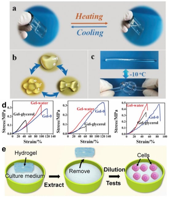 Performance evaluation of cellulose hydrogel and appearance of cellulose hydrogel: (a) photographs showing the thermal reversibility of gel glycerol, (b) photographs showing the remodelability of gel glycerol, and (c) an extended piece of gel glycerin exhibits good tensile properties at −10 °C, (d) tensile stress–strain curves of cellulose hydrogels at 25, −20, and −60 °C (Reprinted with permission from the reference []. Copyright © 2019 Wiley-VCH). (e) Cytocompatibility test of cellulose hydrogels [].