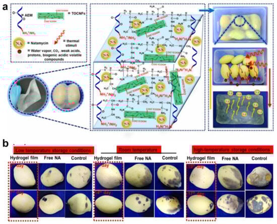 - Shaghaleh, H.; Hamoud, Y.A.; Xu, X.; Liu, H.; Wang, S.; Sheteiwy, M.; Dong, F.; Guo, L.; Qian, Y.; Li, P. Thermo-/pH-responsive preservative delivery based on TEMPO cellulose nanofiber/cationic copolymer hydrogel film in fruit packaging. Int. J. Biol. Macromol. 2021, 183, 1911–1924. [Google Scholar] [CrossRef] [PubMed]
