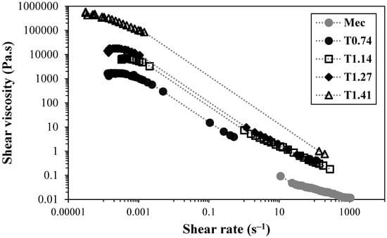 Independently of the CNF nanofiber content, the increase in the concentration of the TEMPO-oxidised CNF suspensions always led to an increase in the viscosity of the suspensions. Conversely, the sample without chemical pre-treatment (Mec) did not show a significant increase in viscosity, which could be attributed to the low degree of fibrillation, of only ca. 6%, whereas the TEMPO-oxidised samples always have a value equal to or above 50%. Thus, even though it could be anticipated from the intrinsic viscosity values that the formed fibrils, employing only mechanical treatment, do not present a short length, the small number of fibrils formed is not enough to increase the sample viscosity. The non-fibrillated cellulose fibres are not able to form networks at the studied concentrations but instead are prone to settle, which explains the low viscosity of the Mec CNF sample at the same concentration as the TEMPO-oxidised CNF samples. In the literature, it is possible to find works reporting gels obtained using cellulose nano/microfibres prepared by only mechanical treatment []. However, the authors did not report the type and intensity of mechanical treatment used, and the level of fibrillation in the sample was not reported. Nevertheless, as the used sample in the reported work is a commercial sample, it was possible to infer that the reported sample (Celish KY100S) presents a level of fibrillation of about 38% [], which is much higher than that obtained using our method. Perhaps the difference in the level of fibrillation is related to a more intensive mechanical treatment, but in our study, we wanted to understand the effect of the chemical pre-treatment on the rheology of CNF suspensions, and thus, the mechanical treatment used was the same for all the samples (two passes only). Figure 3 shows the flow curves of TEMPO-oxidised CNFs with lower (T0.74) and higher (T1.41) charge densities.