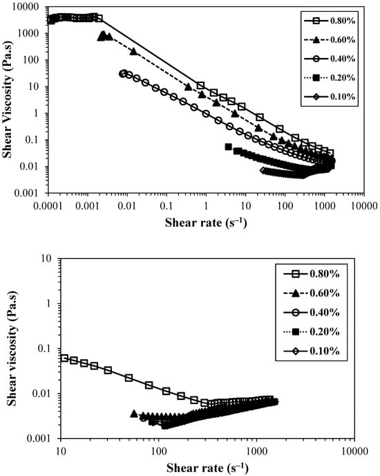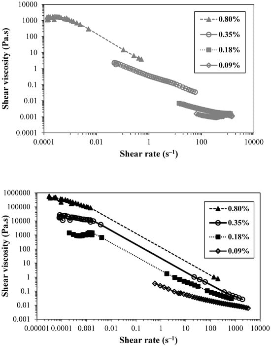 Flow curves of cationic CNFs at different concentrations. (top)—pre-treated with CHPTAC (CH0.78); (bottom)—pre-treated with periodate and GT reagent (GT1.68). Measurements were performed at 25 °C.