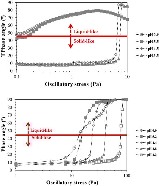 Values of δ above 45° indicate tan δ > 1 and G″ > G′ (predominantly viscous behaviour), while values of δ below 45° indicate G′ > G″ (predominantly elastic behaviour), and δ = 45° indicates the phase transition (G″ = G′) []. Rheological data were treated using the Haake RheoWin 4.20.005 software (Haake, Vreden, Germany).