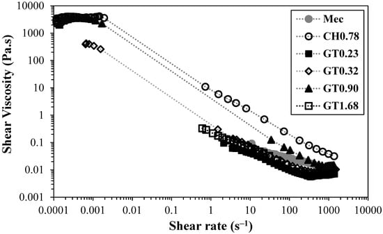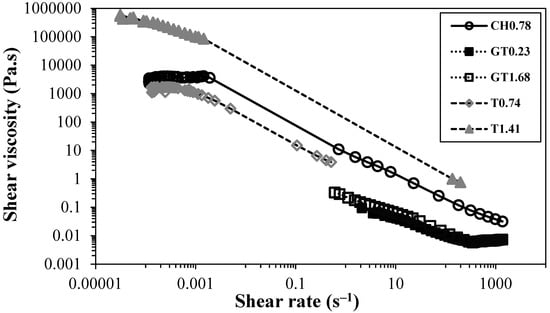 Flow curves of cationic CNFs prepared by different pre-treatments. CH0.78 was prepared by direct cationization with CHPTAC, and the GT series was prepared by two-step cationization. The flow curves were obtained at 25 °C for a CNF concentration of 0.80 wt.%.