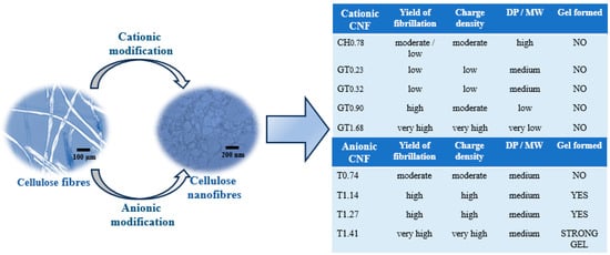 Figure 8 summarises the main properties of the CNF suspensions prepared and their influence on the rheology, referring to the formation or not of gels for suspensions containing 0.80 wt.% CNF in an aqueous medium.