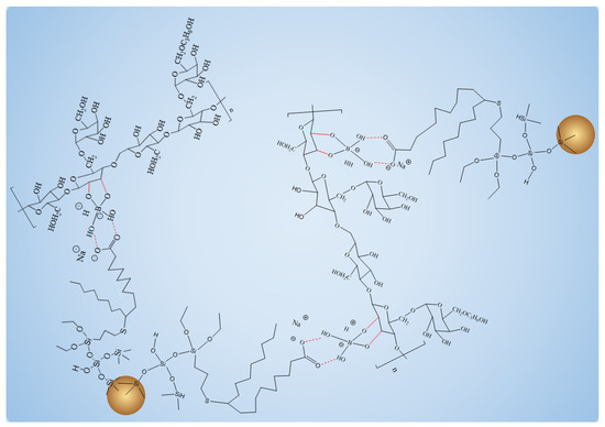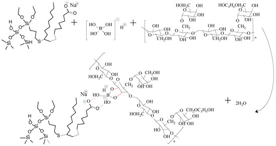 When Na2B4O7 is hydrolyzed, boronate ions are generated in the route of Equations (1) and (2). As shown in Figure 3 and Figure 4, borate ions connected to hydroxypropyl guar gum and carboxyl groups on the modified nano-silica surface through hydroxyl dehydration condensation and hydrogen bonding, respectively, resulting in the dual-level cross-linking structure of nano-silica–borate ions and borate ions–hydroxypropyl guar. Nanoparticles are less affected by molecular motion under shear at high temperatures, thus promoting the stability of the overall structure under the effect of heat/shear [31,32].