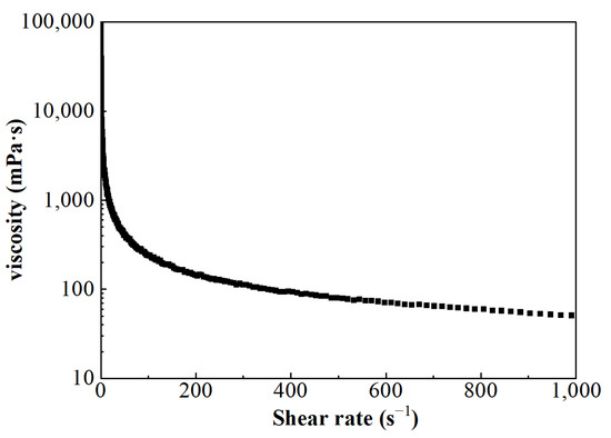 The viscosity of FNG under different shear rates can be obtained according to Equation (5), and the result is shown in Figure 6. Besides the fact that the flow behavior index n was equal to 0.54, which satisfied the condition of 0 < n < 1, the calculated viscosity under low shear rates was very high and the viscosity decreased as the shear rate increased. These show that FNG is a Bingham pseudoplastic fluid with a yield stress of 12.9 Pa.
