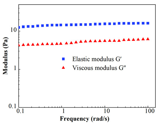 The rheological property shows a significant impact on the load of the pumps, which is usually very high during the fracturing operation. At the same time, it provides valuable parameters and theoretical guidelines for the design of the operation and the optimization of the fracturing fluids, such as in numerical simulation. The rheological measurements were carried out with the rheometer. The viscoelastic modulus of FNG was tested under frequency scanning in the range of 0.1–100 rad/s. The shear stress–shear rate curve was tested to ensure the rheological parameters under the shear rate ranging from 0.01 to 1000 s−1. The details of the tests referred to the Chinese standard of SY/T 6296-2013 [39]. Unless specified, all the experiments were carried out at room temperature, and the same below.