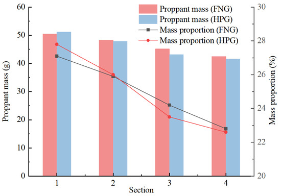 The fundamental objective of fracturing is to promote the seepage of the liquid in the formation through the conductivity of artificial fracture. The fractures would close after the fracturing operation, so the conductivity of the closed fractures mainly rely on the propping of the proppant. Therefore, proppant transportation is critical to the fracturing operation, which is necessary for the transportation of more proppant into the depths of the cracks [40]. The capacity of proppant transportation was compared between FNG and HPG gel. The fracturing fluids with a proppant concentration of 30 wt% were injected into a simulated crack under 80 °C at a rate of 5 mL/min for 1.5 h, and the excess fracturing fluid could overflow from the outlet. The width, height, and length of the crack were 0.15 cm, 20 cm, and 100 cm, respectively. To compare the settlement of the proppant during transportation, the crack was divided into four sections with an observing window on each section. The masses of left proppant belonging to each section were selected, dried, and weighted in sequence after the injection. The proportion of the proppant mass could be obtained according to Equation (6):