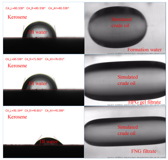 The permeability of the oil phase in the presence of residual water is affected by the interfacial parameters such as the contact angle (CA) and the interfacial tension (IFT) between oil and fracturing fluid filtrates. To analyze the difference in the oil permeability damage between FNG filtrate and HPG gel filtrate, the CA of deionized water (DI water) on the core surface and the IFT between oil and fracturing fluid filtrates were tested.