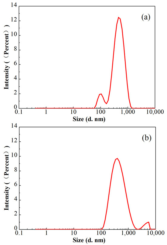 In consideration of the lower polymer dosage in FNG, the sizes of the residue in the broken fracturing fluids were analyzed with a Malvern laser particle size analyzer at 25 °C, and the results are shown in Figure 11. The average residue sizes in both of these two broken fracturing fluids were approximately 360 nm, and the proportion of the residue sized from 200 nm to 700 nm was higher than 90%. However, a peak at 108 nm with an intensity of 8.6% was found in broken FNG, while a peak at 4522 nm with an intensity of 3.5% was found in broken HPG. The size of 108 nm is slightly higher than the size of 58 nm, which corresponds to the peak of the FMNS dimension distribution. The size of the general polymer residue is much smaller than 4522 nm, so the peak at 4522 nm should correspond to the residual gel that had not broken completely due to the high dosage of polymer and cross-linker. Therefore, although the addition of FMNS brings some tiny residue in the broken FNG, it eliminates the much larger residual gel via decreasing the dosage of polymer and cross-linker, which weakens the damage significantly.