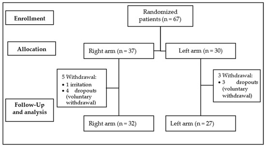 In the clinical trial, from January 2023 to April 2024, 67 patients were enrolled and randomly divided in two groups, with 37 in the right arm group and 30 in the left arm group. Eight patients dropped out of the study, one of them due to irritation; the rest decided voluntarily not to continue the study. Therefore, the evaluated population included 59 patients, as showed in Figure 2.