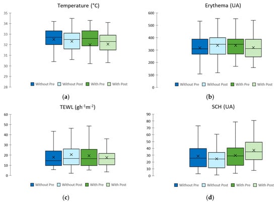 Transepidermal water loss (TEWL) indicates the water that diffuses from the dermis and epidermis through the stratum corneum; when elevated, it is associated with skin barrier dysfunction [59]. It is measured with a Tewameter TM300 (Skin analyser Microcaya S.L., Bilbao, Spain).