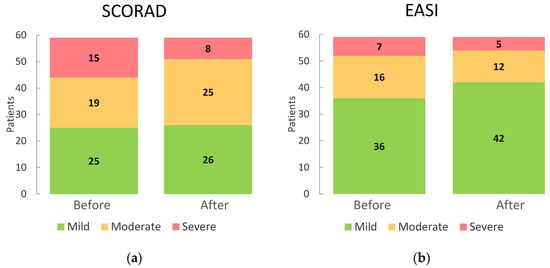 The SCORAD (SCORing Atopic Dermatitis) is a scale for assessing the severity of signs and symptoms of AD, such as the degree of erythema, oedema, papules, exudate, excoriation, lichenification, pain and xerosis, as well as pruritus and sleep disturbance according to the VAS scale [65]. The severity is classified according to the obtained score in SCORAD, mild (<25), moderate (25–50) and severe (>50) [66].