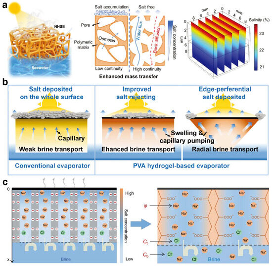 An effective strategy to address this challenge is by diluting the salt concentration at the evaporation interface. Xu et al. [84] developed a high-porosity nanofiber-based hydrogel substrate with a continuous microchannel structure to promote rapid water transport to the evaporation interface, achieving efficient mass transfer and thus preventing salt accumulation (Figure 4a). However, due to contact with free water with higher thermal conductivity, the thermal energy at the evaporation interface might dissipate, affecting evaporation efficiency. To overcome this issue, Li et al. [85] designed a hydrogel substrate with a Janus structure, featuring a hydrophilic bottom and a hydrophobic surface. The hydrophobic top layer acts as a barrier to prevent salt deposition in the light absorption layer, while the hydrophilic channels at the bottom efficiently redirect high-concentration saltwater back into the bulk water, thereby demonstrating superior salt rejection performance. Additionally, strategically managing the accumulation areas or migration paths of salt is also an effective strategy to reduce salt accumulation at the evaporation interface. Tang et al. [63] utilized polyvinyl alcohol (PVA) hydrogel to develop an ISDE system with an innovative inverted three-dimensional conical structure, enhancing the vertical radial transport of saltwater (Figure 4b). Due to the extended transport distance, the movement of salt to the edge regions is inherently slower, resulting in salt progressively accumulating and preferentially crystallizing at the edge regions during evaporation. This strategic process effectively shields the top evaporation interface from direct salt contamination. Lastly, the nucleation and crystallization barrier of salt can be elevated through the use of polyelectrolyte hydrogels, which contain a high concentration of negatively charged functional groups [86] (Figure 4c). This improvement boosts the salt rejection capabilities of hydrogels by leveraging electrostatic forces to disrupt the interactions between salt ions.