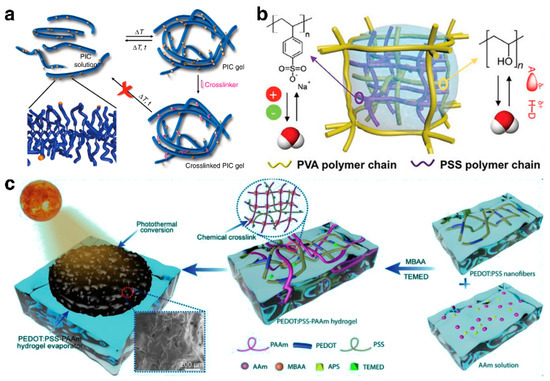 Hydrogel technology has attracted attention due to its abundant raw material sources [93]. Numerous natural polymers, such as cellulose, alginate, and hyaluronic acid, boast long molecular chains and rich functional groups, which can form hydrogels with high hydrophilicity and excellent biocompatibility, either through inherent physical actions or by the addition of cross-linking agents [94]. The formation mechanisms of these hydrogels mainly involve creating physical cross-links or covalent bonds between polymer chains [95] (Figure 5a). To better control key properties such as molecular weight, hydrophilicity/hydrophobicity, or environmental tolerance, numerous synthetic monomers and modified polymers, including acrylamide, methyl methacrylate, carboxymethyl cellulose, and polyvinylpyrrolidone, have been developed [44]. By adjusting the cross-linking density and degree of polymerization of the polymers, their key performance in water transport, thermal conductivity, and mechanical strength can be further optimized [33].
