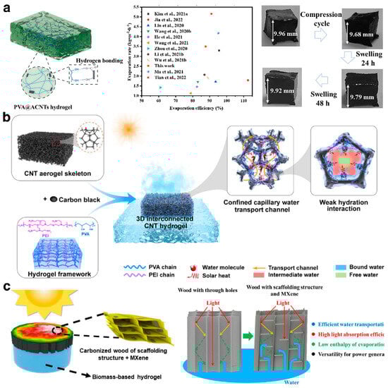 As research into hydrogel technology deepens, composite hydrogels are increasingly gaining attention. Drawing inspiration from rubber reinforcement technology, the development of nanocomposite hydrogels involves the uniform dispersion of nanoscale colloidal particles within a polymer matrix, utilizing the large specific surface area of these nanoparticles to expand the range of surface activity, thereby significantly enhancing the overall performance of the hydrogel [96]. Gao et al. [87] prepared a uniform black PVA/ACNTs mixture by heating and blending acidified carbon nanotubes (ACNTs) with polyvinyl alcohol (PVA), and they constructed a PVA@ACNTs hydrogel-based solar evaporator using a freeze–thaw method (Figure 6a). The porous nature of ACNTs optimized the hydrogel’s porous network, accelerating rapid moisture transfer and steam release during the evaporation process, achieving a high evaporation rate (3.85 kg·m−2·h−1) and photothermal conversion (87.6%). Additionally, the abundant hydroxyl and carboxyl groups on the surface of the ACNTs formed interface hydrogen bonds with the PVA polymer chains, greatly enhancing the mechanical stability of the hydrogel. On another note, Fan et al. [97] developed a PAAc/SiO2-g-PAAm nanocomposite hydrogel using SiO2-g-PAAm as a dynamic cross-linking center, which displayed excellent evaporation performance and rapid recovery and self-healing capabilities. Researchers are also developing composite hydrogel substrates by doping them with functional materials like graphene [50] and metal–organic frameworks (MOFs) [42]. They typically employ layer-by-layer self-assembly techniques or chemical cross-linking methods to ensure effective binding and synergistic interaction among the components, significantly boosting the system’s photothermal efficiency and mechanical strength [98]. Furthermore, various porous materials are commonly used as scaffolds in hydrogels to construct multifunctional hydrogels with intricate structures. Zhang et al. [65] utilized cellular carbon nanotubes (CNTs) as a scaffold, in combination with polyvinyl alcohol (PVA), polyethyleneimine (PEI), and carbon black particles (CBs), to develop a hydrogel with a three-dimensional interconnected topological structure (Figure 6b). This hydrogel is characterized by its plentiful hydrophilic capillary nanochannels and weaker water–polymer polar interactions, achieving an impressive water evaporation rate (3.55 kg·m−2·h−1), and it can effectively generate water in extreme environments. The multifunctional solar evaporator, designed by Pang et al. [12], features a scaffold structure of carbonized wood modified by MXene within a composite biomass hydrogel (Figure 6c). This loose and orderly support structure of the carbonized wood significantly enhances water transport efficiency, boosts capillary forces, and strengthens light absorption by the multiple reflections of light. Moreover, the self-assembled micrometer fiber structure effectively inhibits salt deposition within the scaffold, and the MXene modification in the carbonized wood binds strongly with water molecules, thus lowering the evaporation enthalpy and contact angle.