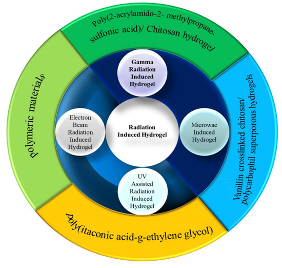 The hydrogels prepared through the interaction between a specific form or range of electromagnetic radiation and polymers or monomers have vast fields of application. Based on the radiation method used, the hydrogels can be classified as shown in Figure 2: