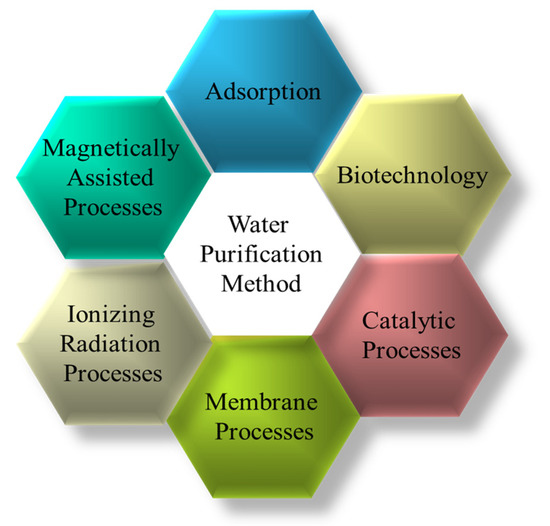 There are few essential elements for an organism to be alive in the environment, and water is one of them. In the modern era, we are producing various consumable products, such as agricultural pesticides, industrial waste, and chemical waste, which directly deteriorate the quality of our drinking water sources [71]. These harmful wastes can lead to various detrimental effects on human health, such as disability, illness, or disorder [72]. Pathogenic microorganisms dominate these wastes, causing water to become tainted. Worldwide, water bodies allow about 2 million tons of impurities from crops, land, factories, and drainage waste to escape, resulting in approximately 1400 deaths per day [73]. The WHO’s recent report predicts that by 2025, 50% of the world’s population will experience a pure water crisis [74]. Furthermore, global climate change could exacerbate the unequal distribution of drinking water and exacerbate water scarcity issues. However, the harmful substances in the tainted water must be decontaminated before use. Water purification is eliminating harmful substances such as chemicals, solids, biological toxins, and gases from the water to make it suitable for the intended purpose [71]. Hence, the evolution of a methodical, inexpensive, environmentally safe, and adaptable technology is very significant to water purification [73]. The limitations of using different micro-particles to eliminate contrasting contaminants vary, such as the time it takes for the micro-particles to reach the finite surface area for the transport capability of the toxic substances [5]. Likewise, for the 3D graphene-based macrostructures for water treatment, the low-dimensional nanomaterial’s restraining forces correlate with its small size. First, it forms clusters in water and loses a lot of its activity. Second, it is hard to return to the nanomaterials drained from the water being studied, and it costs a lot to perform a membrane-based dissociation process. Furthermore, it also encounters environmental and health issues. However, photocatalytic advanced oxidation processes for water treatment have some problems, such as low eradication efficiency, high costs, a lot of work, too much dirt output, being good for limited improvement, not being suitable for wide use, and making some harmful substances [75]. Figure 3 presents the various methods mostly used for water treatment where the ionizing radiation processes are receiving priority. Table 2 lists the worthy materials used to purify contaminated water.