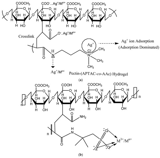 Metal adsorption mechanism on (a) Pectin-(APTAC – co - AAc) and (b) Pectin - AAm -AMPS hydrogels prepared by gamma radiation, replotted with permission.