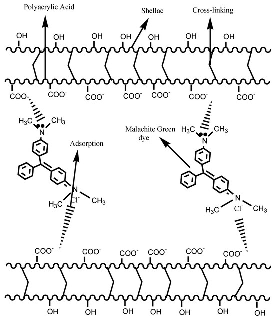 Probable mechanism of cationic malachite green dye adsorption by radiation-induced polyacrylic acid/shellac hydrogels [116].