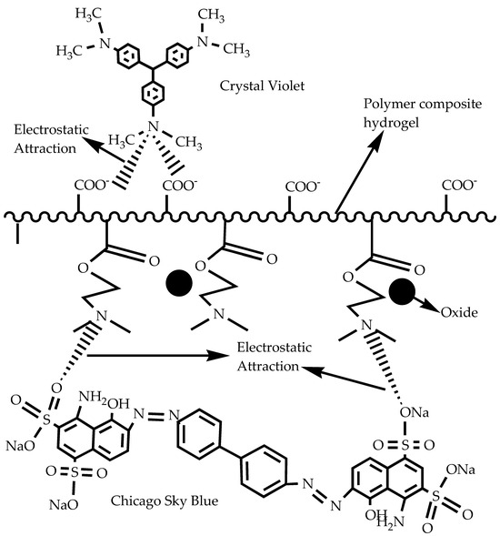 Heat-treated chitosan-grafted (CA-co-DMAEMA)/Fe2O3 hydrogels can absorb both cationic (Crystal Violet, CV) and anionic (Chicago Sky Blue, CSB) dyes from water or solutions. Both dyes are carcinogenic when discharged into the environmental system. Fe2O3 nanoparticles enhance the magnetic properties of the hydrogels, facilitating their easy separation following dye absorption. Figure 6 illustrates the likely absorption process of CV and CSB dyes. The sponge-like structure and many functional groups in the hydrogel make it easier for the dyes to stick and absorb. The hydrogel can interact with many different types of dye molecules because it is amphiphilic, which means it has both hydrophilic (which attracts water) and hydrophobic (which repels water) parts. Functional groups in the hydrogel, such as amine and carboxyl groups, connect with the dyes through the porous structure shown in Figure 6. This dual mechanism effectively removes both CV and CSB from the solution, thereby significantly reducing the risk of environmental contamination. The hydrogel’s design not only captures the dyes but also allows for regeneration and reuse, making it a sustainable solution for wastewater treatment. The integration of such advanced materials into environmental management strategies holds great promise for the future of water purification technologies [22].