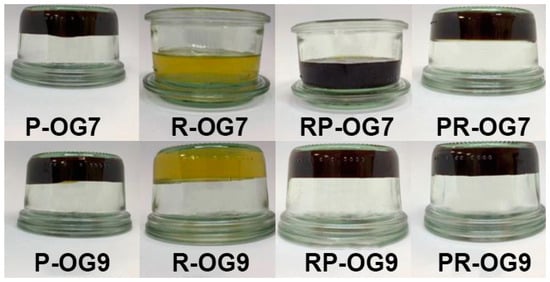 The visual appearance of the developed EC oleogels is presented in Figure 1. As shown by other authors [5,27], our findings also suggest that the concentration of EC substantially impacts the stability, structure, and texture of the oleogels. For the samples with 7% EC, the different combinations of oils resulted in various levels of gel stability. Only two formulations formed self-standing oleogels, entrapping the liquid oil in a three-dimensional network. According to Figure 1, among the four OG7 samples, only P-OG7 and PR-OG7 exhibited a solid gel structure, while R-OG7 and RP-OG7 did not solidify and remained in a semi-liquid state.