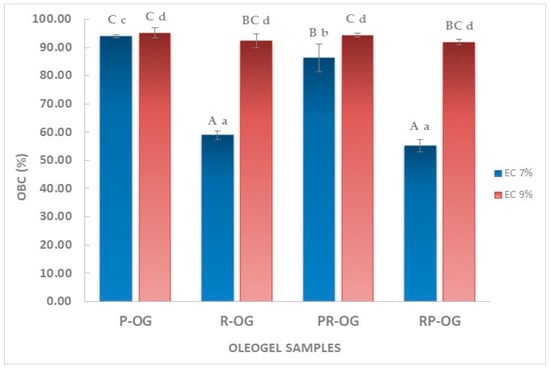 Oil-binding capacity of oleogel samples. Different capital letters indicate significant differences within oleogel samples (p < 0.05). Different small letters indicate significant differences within oleogel samples with same EC concentration (p < 0.05).