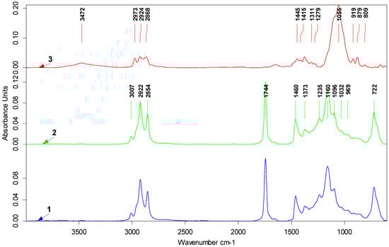 ATR-FTIR spectra of 1—PO; 2—RO; 3—EC.