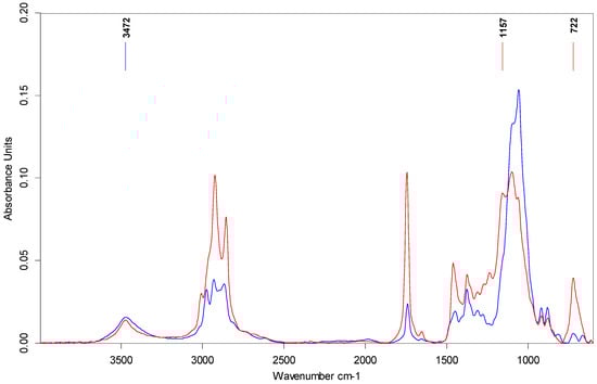 Also, in the case of oleogels with 9% EC, a decrease in the intensities of the bands specific to oils was observed (C-H stretching, C=O stretching, C-H bending, CO stretching, rocking C-H, and C-C-H bending vibrations) and there was an increase in the intensity of the specific EC band located at 1055 cm−1. The band at 1160 cm−1, due to CH2 bending from the oil’s spectra, in gels with 7% EC, shifted at 1155 cm−1 and decreased significantly in intensity, while in gels with 9% EC, it was recorded as a shoulder. Silva et al. [33] reported similar behavior, attributed to the establishment of polymer–solvent interactions between oils and EC in the oleogel network. As an effect of these interactions, the fatty acids from triacylglycerols were more strongly anchored by binding in the three-dimensional matrix of the gels, having a reduced steric mobility, which led to a decrease in the intensity of in-plane and out-of-plane bending vibrations (1157 cm−1 and 722 cm−1) characteristic for -CH2 groups, previously also shown by Lupi et al. [47].
