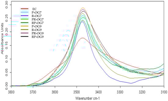 ATR-FTIR spectra in 3800–3250 cm−1 range of EC and oleogel samples.