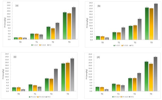 Evolution of PV of oils and EC oleogels during storage: (a) PO and P-OGs, (b) RO and R-OGs, (c) PO:RO (3:1) and PR-OGs, (d) PO:RO (1:1) and RP-OGs.