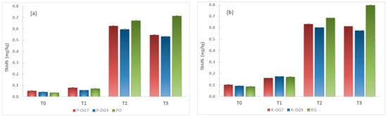 The peroxide value (PV) was used to measure the oxidation level of oleogels as evidence of primary oxidation after processing and during storage. In the primary stages of oxidation, fatty acids react with oxygen to form odorless compounds such as peroxides [48,49]. The recorded PVs for oils and oleogels, after processing and during storage, are shown in Figure 6. The initial PV of the oils and oleogels (T0) recorded values between 1.150 ± 0.139 meq O2/kg oil (PO) and 2.970 ± 0.192 meq O2/kg oil (RP-OG7) and suggest that primary oxidation levels after processing are low (<10 meq O2/kg oil). All the oleogel samples showed a higher PV compared to the fresh oil before storage, and it could be attributed to the fact that the oils were heated at high temperatures during the oleogel preparation. After 7 days of storage (T1), a linear increase in PV can be observed for all the samples. The results showed that PO (3.380 ± 0.354 meq O2/kg oil) was the most stable oil sample, while in terms of oleogels, the P-OG9 (3.970 ± 0.277 meq O2/kg oil) was the most stable and R-OG7 (5.420 ± 0.304 meq O2/kg oil) the least stable samples. These values are considered satisfactory according to the international regulations for edible oils (less than 10 meq O2/kg oil) [50]. PV recorded a significant increasing trend in all samples after 14 days of storage (T2), indicating an accelerated degradation process. Except for R-OG9 (10.18 ± 0.344 meq O2/kg oil), PV for all other oleogels was less than the acceptability level. PV continued to increase for all samples during storage, and after 21 days (T3), it reached maximum values, exceeding the acceptability limit due to the formation of advanced oxidation products.