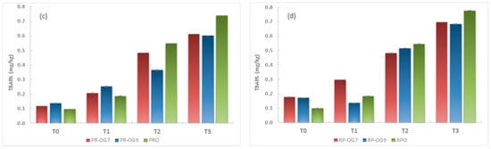 Evolution of TBARS value of oils and EC oleogels during storage: (a) PO and P-OGs, (b) RO and R-OGs, (c) PO:RO (3:1) and PR-OGs, (d) PO:RO (1:1) and RP-OGs.