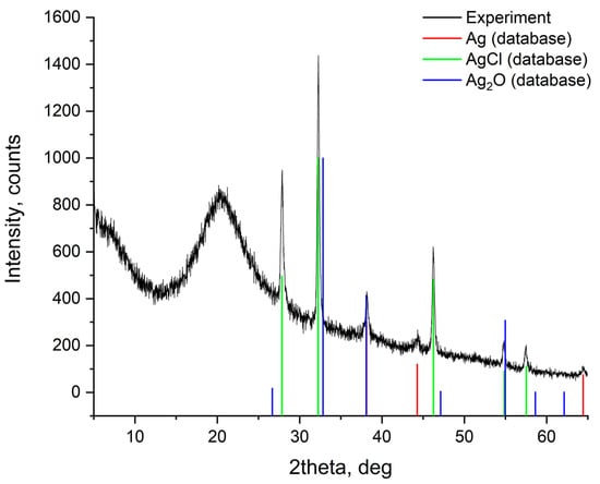 The sample of Silver Shell™ solution was annealed at 80 °C over 2 h to obtain a film for the phase composition study. The PXRD data collected for the material are demonstrated in Figure 1. The diffractogram illustrates the presence of AgCl, Ag2O, and Ag phases, which corresponds to the method of solution synthesis developed at Chitozan Health LLC. The synthesis includes the precipitation of AgCl submicron particles into a chitosan solution that stabilizes the particles by increasing the zeta potential and reduces silver ion migration from silver particles. Narrow characteristic peaks corresponding to the identified phases indicate the regions of high crystallinity.